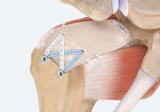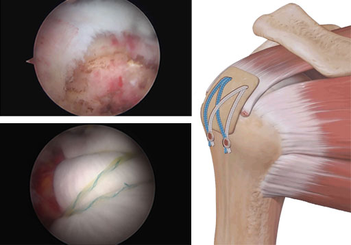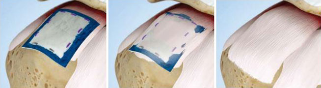 올라간 극상건 자리에 인공진피를 이용하여 상부 관절막을 재건해주는 이 치료법은 기술적으로 매우 복잡한 수술이므로